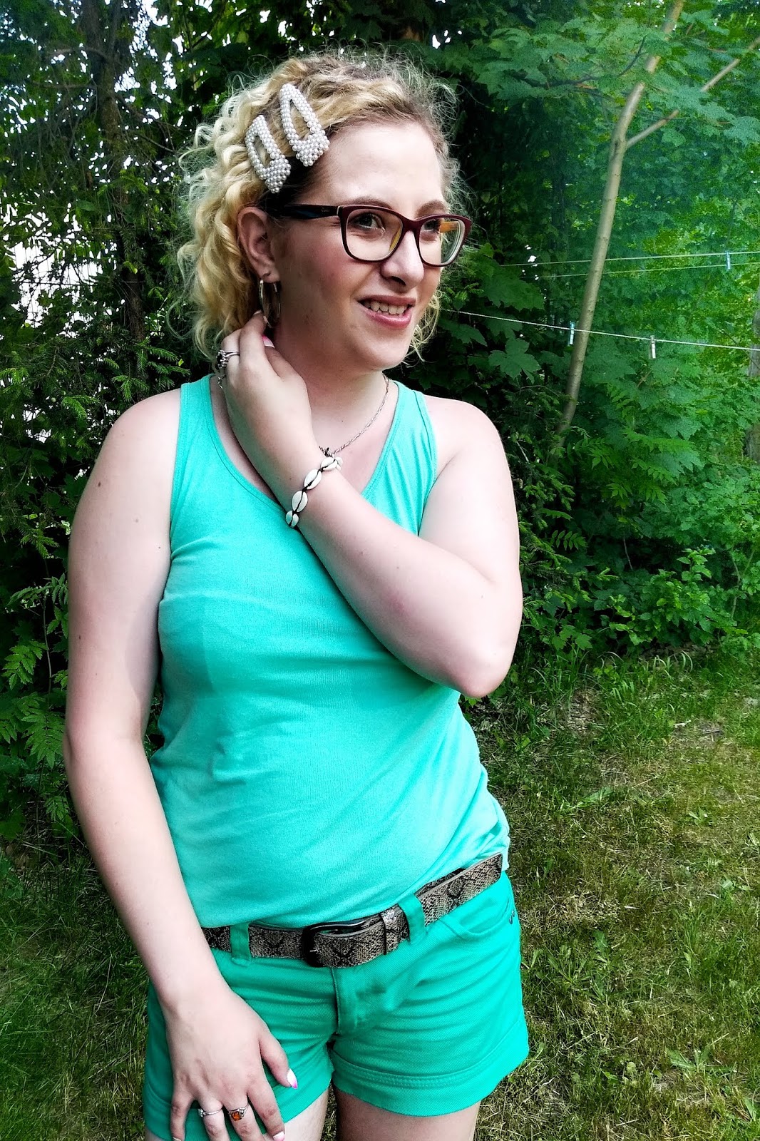 Otóż, wpięłam we włosy perłowe spinki, a przecież ozdoby tego typu są teraz bardzo na topie. Widać je niemal na każdym kroku, na każdej sklepowej półce. Przybierają różne postacie; najczęściej widuję podobne do tych, które dziś pokazuję, oraz w kształcie kokard. Oprócz spinek, równie chętnie wykorzystywane przez influencerki są opaski, gumki i chustki. Jak da się zauważyć, w tym sezonie bierze się sporo na głowę. :)